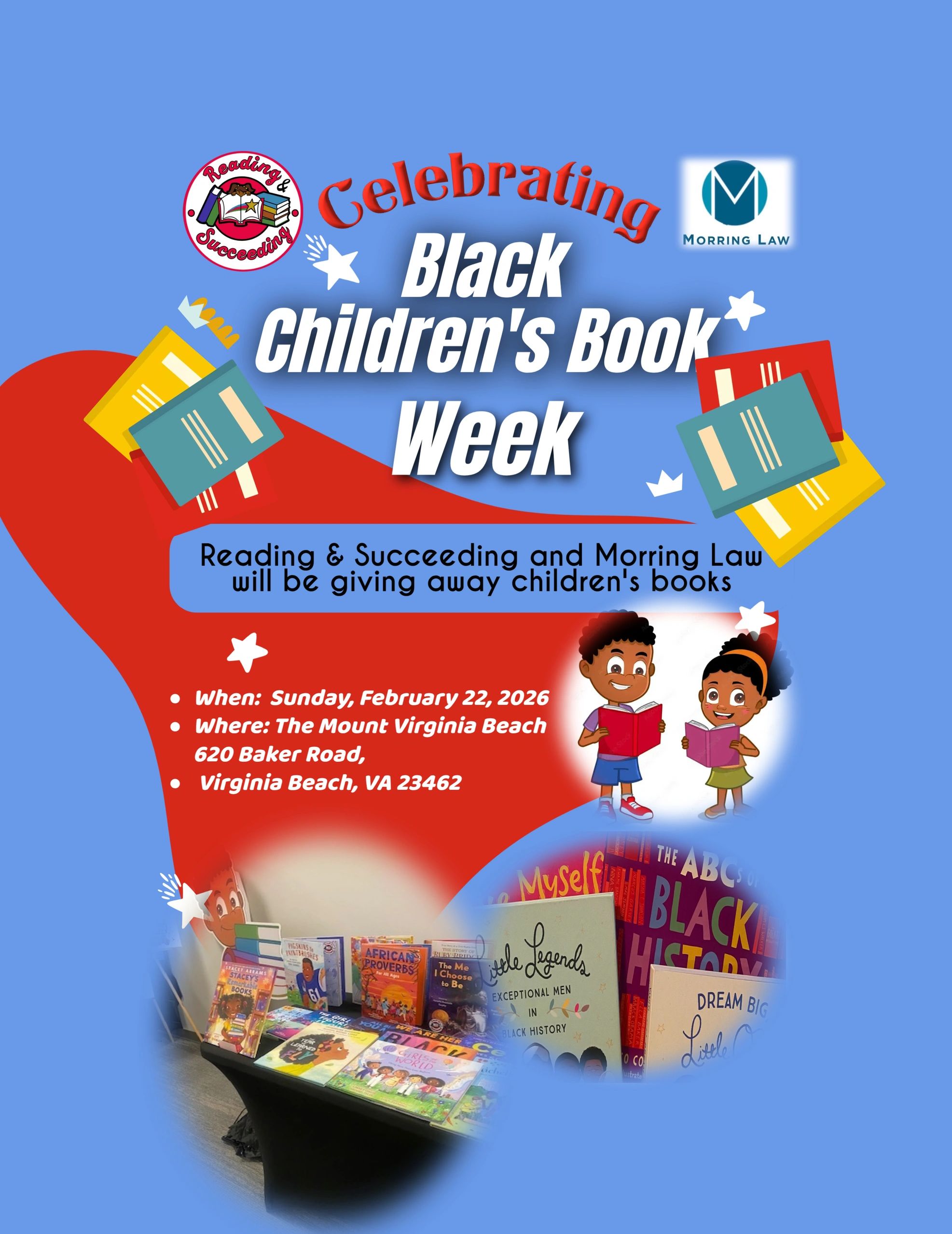 Reading & Succeeding and Morring Law, in celebration of Black Children's Book Week, will be giving away children's books at The Mount Virginia Beach, located on 620 Baker Road, Virginia Beach, Virginia 23462, on Sunday, February 22, 2026. NOTE: One Book per Child.